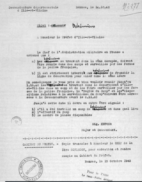 Le 4 octobre 1940, l’administration militaire allemande charge les préfets de la zone occupée d’organiser l’internement des Zigeuner dans des camps pris en charge par les autorités française. Par ordonnance du 16 octobre, cette décision est appliquée par le commandant allemand de la place de Rennes. Sur le document exposé, un fonctionnaire de la préfecture a barré à la plume le terme "tsigane", ressenti comme résultant de la pratique raciste nazie, par celui de "bohémien", moins connoté, sans toutefois revenir à l'expression administrative française antérieure "nomade" mais la terminologie ne change rien à l'application de la mesure.