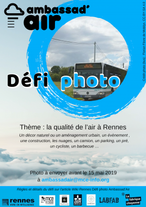 Cette année 2019, Ambassad'Air lance un défi photo sur le thème de la qualité de l'air à Rennes. Les photos sélectionnées permettront ensuite de réaliser une exposition sur le même thème qui sera disponible à la MCE.