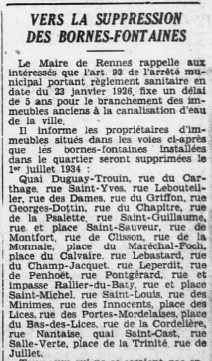 Il existait à Rennes de nombreuses bornes-fontaines, mais la généralisation de la distribution d'eau par canalisation amena le maire à supprimer le 1er juillet 1934 les bornes encore en service. Toutefois certaines resteront en place, telle celle de la rue Saint-Hélier (non visée par le maire en 1934) jusque dans les années soixante.