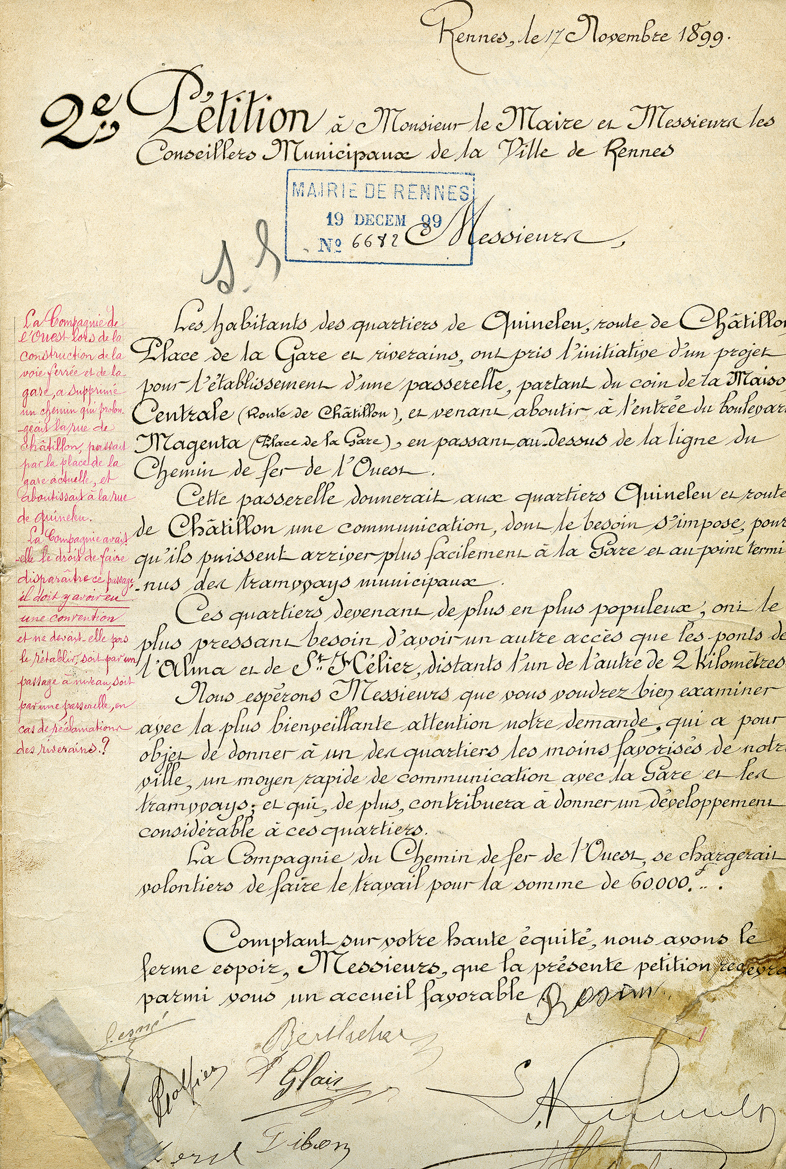 Pétition des habitants des quartiers du sud de Rennes en 1899. Archives de Rennes, 1 O 88.
