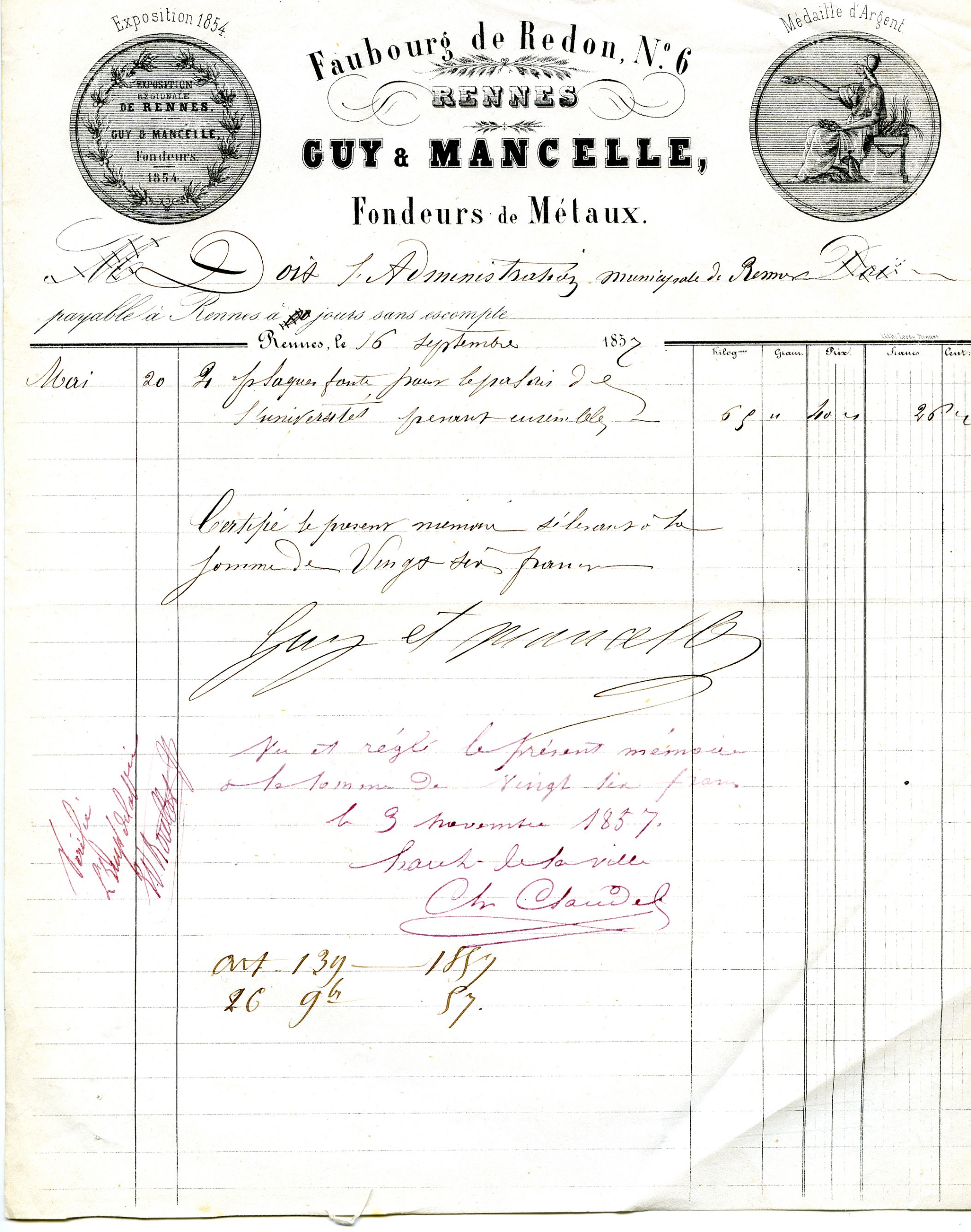 Facture à entête de Fondeurs métaux, 6 faubourg de Redon, Archives de Rennes, 10 Z 39.