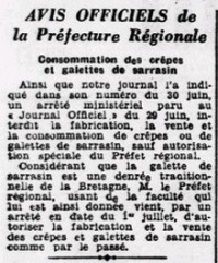Un arrêté ministériel du gouvernement de Vichy, paru au Journal officiel du 29 juin 1944, interdit la fabrication, la vente et la consommation de crêpes ou de galette de sarrasin, sauf autorisation spéciale du préfet. Motif : pénurie de combustibles.