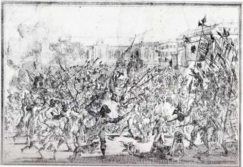 "Que le lendemain, 27 janvier, la jeunesse de rennes, doublement indignée des actes d'inhumanité et d'orgueil exercés sur elle, s'était armée de pistolets et d'épées, s'était portée sur la place du Palais et avaient demandé aux nobles, raison des voyes de fait commises avec mépris, par leurs valets, qu'alors plusieurs duels avaient eu lieu sur la place et dans les rues dans lesquels deux jeunes nobles avaient succombé" [4]