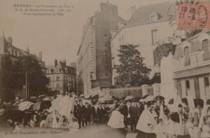 Du huit septembre 1634. La Nostre-Dame du Veuff (vœu) et situation et representation de la ville de Rennes, laquelle estoit toute de pur argent, fut prinse dans la Maison-de-Ville et portée par huit bourgeois, et lun desquelz portoit ung drappeau blancq armoyé de fleurs de lys dor et hermines noires; et au millieu duquel drappeau y avoit d'un costé le Veuff depainctz, et de Jaultre costé ung Sainct Roch; et le portoit Mr de la Brosse du Quelnecq, en sortant de la Maison de Ville, estant assistéz de trompettes, viollons, bonbardes et haulboys, tembours et aultres instruments, avecq grande quantité descoliers partye accoustrez en blancq et en rouge, et laultre partye en Anges; et furent conduictz dans leglise St Pierre où le veuf fut presanté et mins par les bourgeois advis dun autel qui avoit esté dressée à la porte du cœur (chour); où en lendroict, Mons" de Rennes dist et fist une prédication, et apprès celebra la grand'messe et benesquit le Veuff; et fut porté à la procession par la ville, scavoir de St Pierre par la Cordonnerye et Grand Bout de Cohue et Minterye, et Grand Pompe, les Baudrairyes et rue de la Sisne, Cherbonnerye et rue aux Foullons, et porte aulx Foullons à Bonne Nouvelle où le dict vœux fut pozé sur ung petit autel qui estoit dressé dans le millieu du chœur de Bonne Nouvelle ; et de là fût porté devant la Nostre Dame, a costé du grand autel soulz la grande vouste. Et estoient les rues tendues comme au jour du sacre, et y assistèrent touttes les Fraiyres avecq leurs lumineres, et tout le clergé avec Messieurs de la Cour en robes rouges, assistez de MMrs du Siége en corps, et les Bourgeois en corps; et fut tiré plussieurs canons, avecq ung feu de joye sur la Lice. - Et le lendemain, il fut faict une procession généralle, la Cour en corps, MM. du Siége et Bourgeois, et alla ladicte procession de St Pierre à la Santé. Journal d'un bourgeois de Rennes au XVIIe siècle