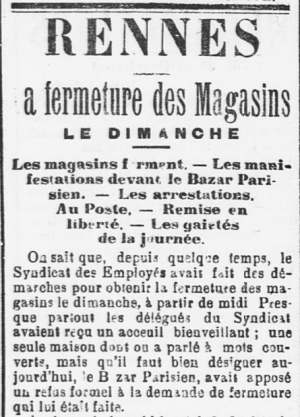 Encore la question ne se posait-elle à l’époque que pour le dimanche après-midi, car le dimanche matin les magasins étaient évidemment ouverts. À Rennes, elle se cristallise au Grand Bazar Parisien de la place Rallier du Baty. La démarche du Syndicat des Employés visant à une fermeture à midi avait, semble-t-il, reçu partout un accueil favorable, sauf de la direction du Grand Bazar Parisien, dont le directeur, M. Guillemot, avait opposé un refus formel.