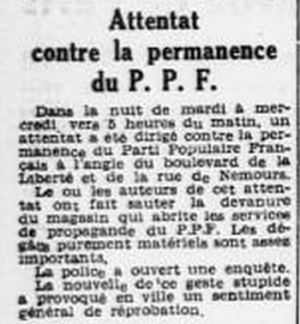 Coïncidence, un attentat avait eu lieu, dans la nuit du 13 au 14, à la permanence du Parti populaire français (PPF), situé à l'angle du boulevard de la Liberté et de la rue de Nemours provoquant de considérables dégâts matériels au magasin qui l'abrite. " Ce geste stupide a provoqué en ville un sentiment général de réprobation" affirmera l'Ouest-Éclair du 15 juillet.