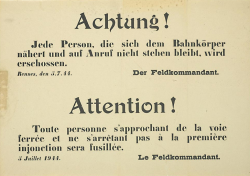 Dès la fin juillet 1940, le "commandant en chef" allemand informe la population rennaise qu'"un câble militaire fut saboté de manière perfide" et que "de pareils actes de sabotages seront punis de la peine de mort". En outre, dans les endroits où de pareils actes seront constatés, au moins deux hommes seront arrêtés comme otages, jusqu'à ce que le malfaiteur soit "constaté"[3]. Ce texte sera bientôt appliqué.