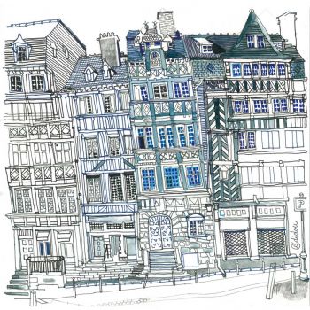 On remarque, au débouché de la rue du Champ-Jacquet, deux minuscules échoppes répertoriées sur la plan Hévin de 1685. On admire la rangée d'immeubles à pans de bois, côté nord.