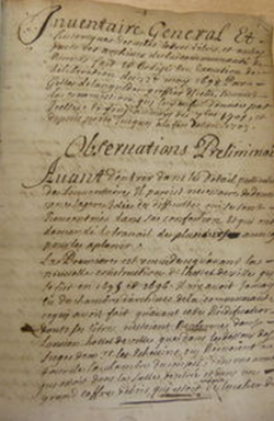 Dans l'hôtel de ville en cours de réaménagement une "chambre des archives" est prévue mais les documents ont souffert du déménagement. "[Jettés] confusément dans de grands sacs à bled" pour être transportés au couvent des pères minimes pendant la durée des travaux de réaménagement, et sont à leur retour vidés en un tas. Il met un soin particulier à rendre leur cohérence aux liasses.