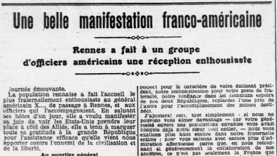 Mais ce même jour, les Rennais vont avoir l'occasion de vérifier si le portrait qu'ils viennent de lire est ressemblant car ils accueillent avec enthousiasme un groupe d'officiers américains conduit par le général...X ! La place de la Mairie est noire d'une foule qui entonne la Marseillaise puis entend l'hymne américain joué par une musique américaine qui vient de s'installer sur le kiosque. Le maire Jean Janvier, puis le préfet Juillard et le général d'Amade, commandant de la 10e Région, y vont de leur discours et, après acclamation de la délégation apparue au balcon de l'hôtel de ville, "les musiciens américains, inlassables, ont donné un concert qui a duré deux grandes heures" rapporte l'Ouest-Éclair du lendemain.