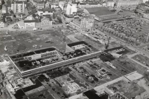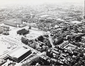 [[Fichier:D%C3%A9but_du_quartier_Colombier.png|300px|left|thumb|A gauche du Champ de Mars et de la salle omnisports le début des travaux du nouveau quartier Le Colombier (Musée de Bretagne)]] | |||