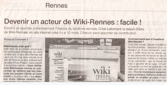 [[Fichier: | [[Fichier:Devenir_acteur_de_W_R.png|800px|right|thumb|Un article du journal Ouest-France le 18 janvier 2011 incite à aller sur Wiki Rennes et à y contribuer]] | ||