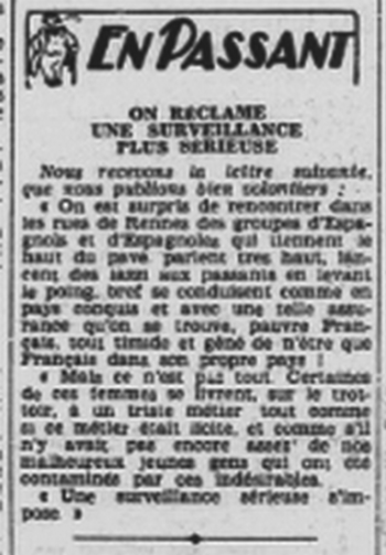 En avril 1938 c’est un nouvel afflux, essentiellement des femmes et des enfants descendant en gare de Rennes, qu’on loge au camp de Verdun, route de Redon : 318 le 14 avril, 267 le 16 avril – dont 64 enfants. Le 24 avril on en est au quatrième convoi. Le 25 avril ils y sont 816 dont une trentaine souhaitent regagner leur patrie. L’année 1939 est encore un temps d’exode déclenché par la victoire des troupes de Franco : le 2 février arrivent 450 femmes et enfants et Rennes apparaît comme la « gare régulatrice" des divers convois qui sont montés vers l’ouest. Le 7 février 900 réfugiés continuent sur Quimper alors qu’autant sont descendus à Rennes où c’est toujours le camp de Verdun et l’ancien moulin de Saint-Cyr qui les reçoivent. Rennes atteint le chiffre de 3000 réfugiés qui ont été aussi bien accueillis que possible par les autorités et les associations d’aide. On voit transparaître chez certains Rennais une animosité dont se fait l’écho, le journal en mars transmettant la demande d’ « une surveillance plus sérieuse ».