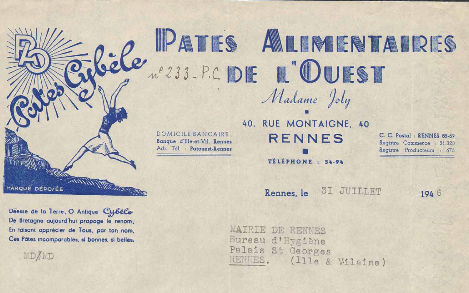 • Facture à entête de l'usine de pâtes Cybèle (actuelle maison de quartier Francisco-Ferrer), 1946.