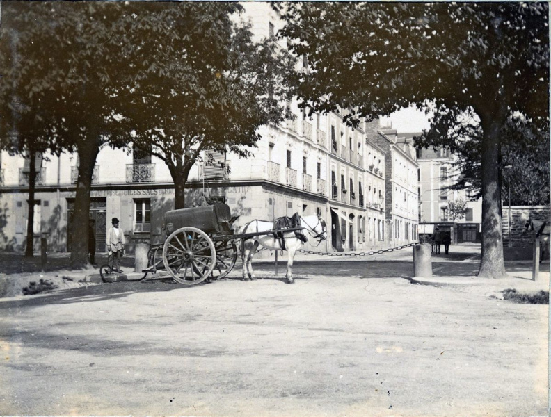 Le photographe est sur le Champ de Mars, en bordure du boulevard Magenta. L'immeuble du coin a gardé sa plaque "eau à tous les étages" postérieure à cette photo et on peut encore deviner l'inscription du magasin de vente de toiles et sacs alors installé au rez-de-chaussée. Une voiture-citerne du service municipal de nettoiement s'approvisionne à une borne du réseau d'eau opérationnel depuis dix ans.