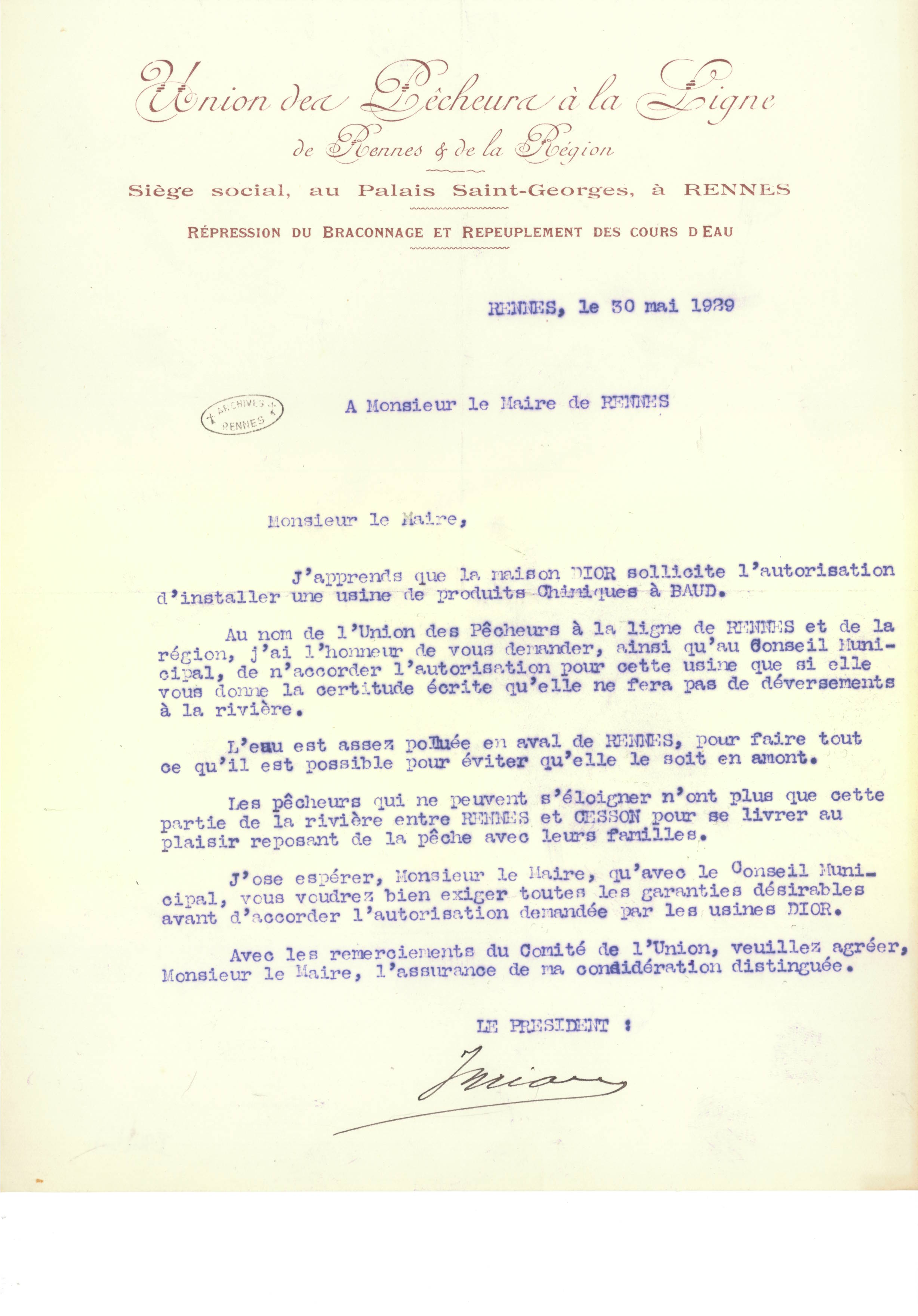 Lettre de protestation de l'Union des pêcheurs à la ligne de Rennes et de la région contre l'installation de l'usine Dior. Archives de Rennes I 94 bis I