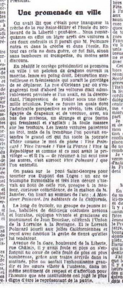 A 17 h 00, le dimanche 31 mai, le train amenant le président de la République, Raymond Poincaré, arrive de Saint-Brieuc en gare de Rennes, alors que sonnent les cloches des églises. Sont présents le préfet Saint, le maire de Rennes Janvier, les députés et les préfets des autres départements bretons. C'est dans une daumont (voiture découverte attelée de six chevaux) que le président prend place avec le maire et le général pour descendre l'avenue de la gare noire de monde et où s'agitent des milliers de petits drapeaux tricolores accrochés aux arbres. Un détour place de la mairie où l'acclament des milliers de Rennais et le cortège gagne la préfecture à 18h00 d'où il se rend ensuite au palais de justice pour un banquet offert par la ville de Rennes et la chambre de commerce dans la salle des Pas-perdus. C'est donc M. Janvier qui fait l'historique et l'éloge de sa "ville de Rennes, porte ouverte par où la civilisation française se répandait dans l'Armorique occidentale", puis le président de la chambre de commerce, M. Oberthür, qui s'exprime, rappelant l'action du chef de l’État pour sauvegarder l'indépendance nationale, et M. Deschamps, député de la 1ère circonscription.