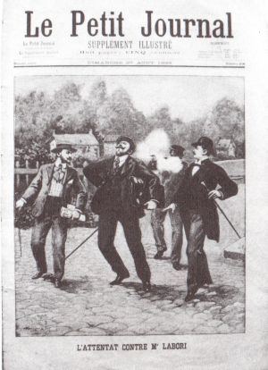 Labori est caricaturé dans la presse étrangère en taureau faisant valser les corps des officiers généraux. Le 14 août 1899, à six heures du matin, il quitte son logement, boulevard Laënnec pour gagner, accompagné du colonel Picquart et du cousin de ce dernier, le lycée pour l'audience. Sur le pont du quai de Richemont, il s'affale, victime d'un coup de feu tiré dans le dos. Le croyant mort, ses compagnons s'élancent à la poursuite de l'assassin sur le chemin de halage, et celui-ci écarte ceux qui veulent l'arrêter en criant "J'ai tué un dreyfusard !". On perd sa trace au-delà de la rue Alphonse Guérin. L'annonce de la mort de Labori déclenche un tumulte dans la salle d'audience du lycée entre dreyfusards et anti-dreyfusards, qui déborde bientôt sur les quais. Labori, blessé, est amené à son domicile puis transporté au domicile de Victor Basch. Lajat, maire de Rennes et le député Le Hérissé signent une affiche "Aux habitants de Rennes", dénonçant "l'abominable attentat" et les incitant à résister "aux provocations, d'où qu'elles viennent [...] Vous aurez ainsi bien mérité de la France et de la République et servi le bon renom de notre vieille cité bretonnes". Labori revint à l'audience le 22 août [1].